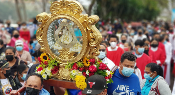 Imagen en la sede parroquial, en oración frente a la Morenita de Suyapa. Por: María Guadalupe Macoco V. Fotos…
