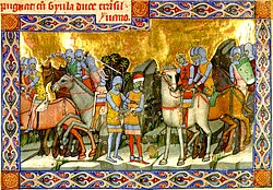 A Képes krónikaegyik illusztrációja: István király elfogatja Gyula erdélyi vezért 1003-ban.