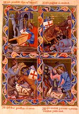 Magyar Anjou-legendárium 1. kép A király kereszttel védekezik a démon ellen 2. kép Szent László harca a kunokkal 3. kép Szent László megsebesül 4. kép Szent László birkózik a kunnal, akinek lábát a lány elvágja