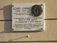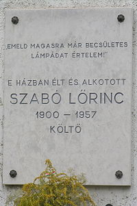 Szabó Lörinc emléktáblája egykori lakhelyén, a Volkmann utca 8. szám alatt