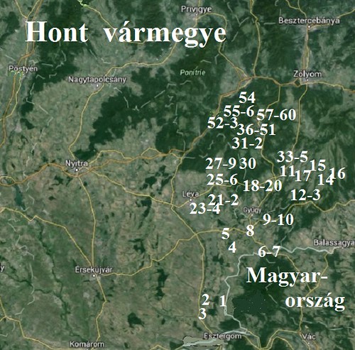 A Hont vármegyével kapcsolatos térképek: 1.  a vármegye címere, 2. a vármegye a történelmi Magyarországban, 3. a vármegye körülbelüli helye a mai Szlovákiában, 4. a fényképek sorszámai a térképen jelzik a sorszámozott fényképek helyeit.