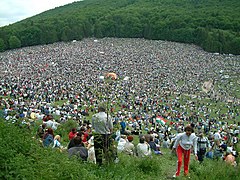 Zarándokok tömege a csíksomlyói búcsú helyszínén