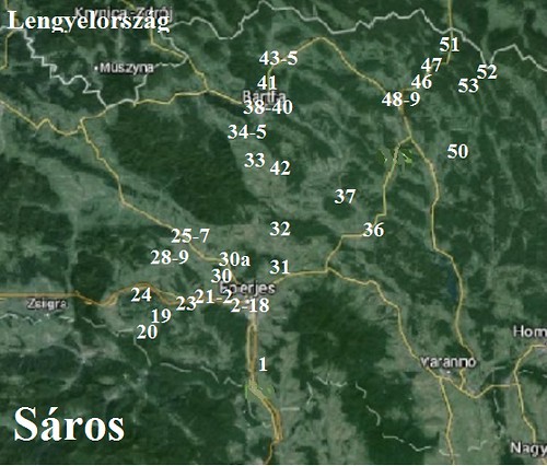 A Sáros vármegyével kapcsolatos térképek: 1. a vármegye címere, 2. a vármegye a történelmi Magyarországban, 3. a vármegye körülbelüli helye a mai Szlovákiában, 4. a fényképek sorszámai a térképen jelzik a sorszámozott fényképek helyeit.