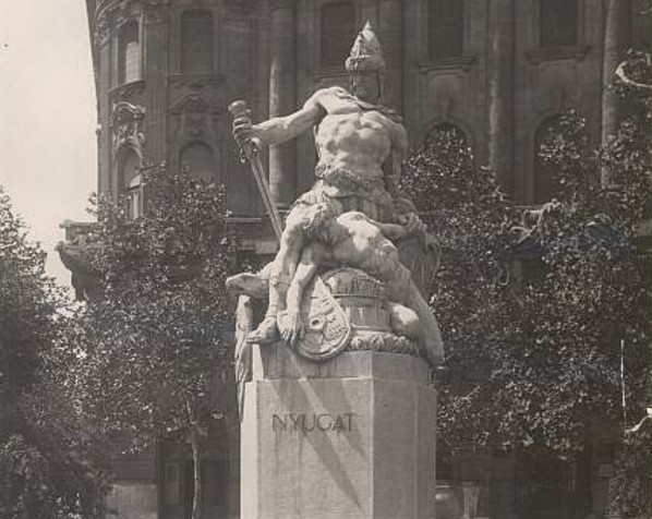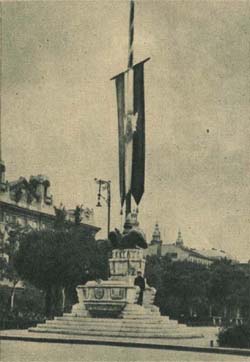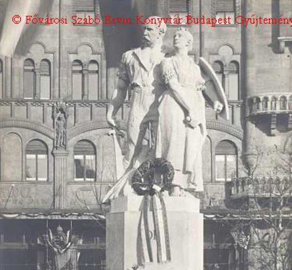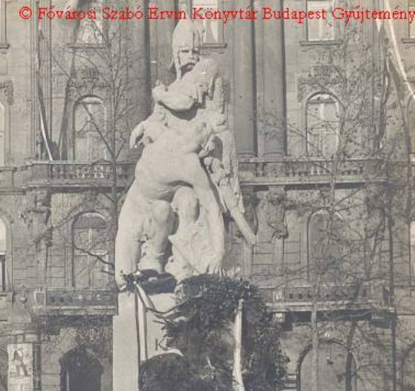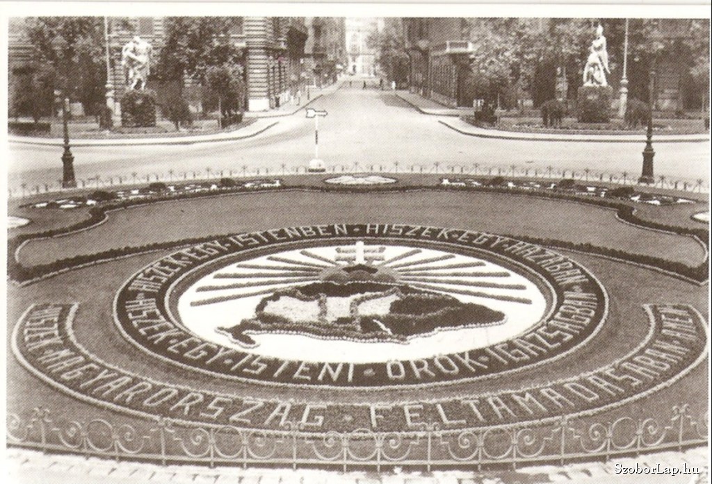 1921. január 16-ától ezen a téren álltak a trianoni békeszerződésben elveszített országrészeket jelképező, szobrok. (korabeli, a szerző tulajdonában lévő képeslap)