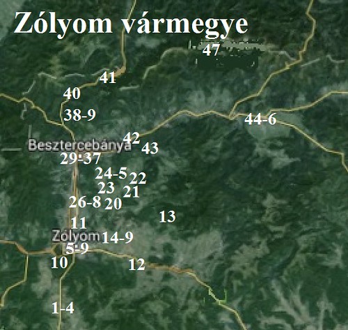 A Zólyom vármegyével kapcsolatos térképek: 1. a vármegye címere, 2. a vármegye a történelmi Magyarországban, 3. a vármegye körülbelüli helye a mai Szlovákiában, 4. a fényképek sorszámai a térképen jelzik a sorszámozott fényképek helyeit.